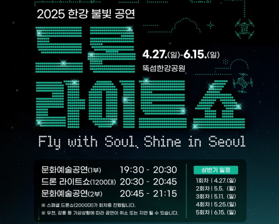 서울의 밤하늘을 수놓는 ‘한강 불빛 공연: 드론 라이트쇼’는 2025년에도 뚝섬한강공원에서 화려하게 펼쳐지며, 각각 다른 테마로 구성되어 다양한 감동을 선사할 예정입니다.